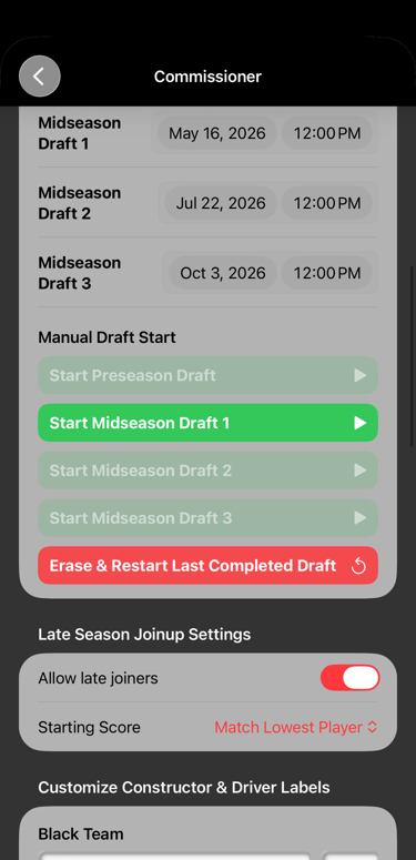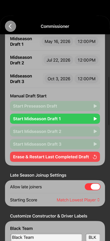 Take the lead to create and run a season with full commissioner-grade controls; set league policies, customize driver and constructor asset naming, and direct the season draft program.