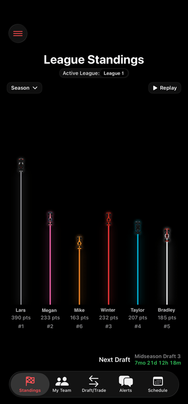 Scores for each race week's results post immediately. Your team's position in the league is dynamically displayed with intuitive controls for historical and competitor team score review.