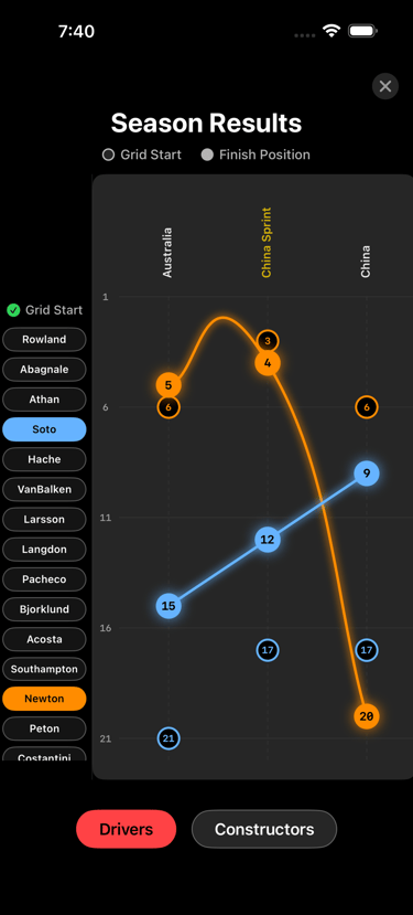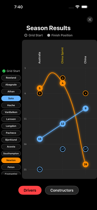 Track Driver and Constructor results across the season. Rich and intuitive data screens make it easy to spot potential, and when it's time to bench a beloved team asset.