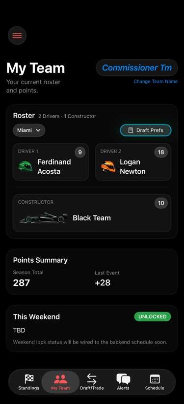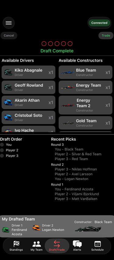 2. You pick drivers and constructors from the full grid in draft order, from a limited pool. Your pick pulls that driver/constructor out of the pool, and puts them on your team.