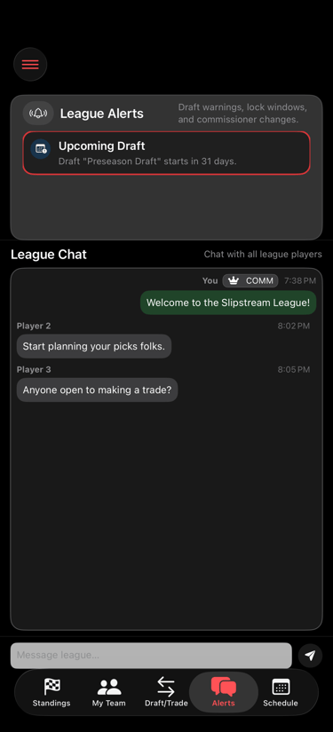 Alerts keep you up-to speed with key league events, out-of-cycle free agent trades, and Commissioner actions.