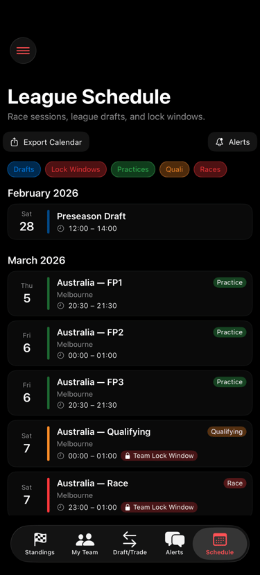 The premier streamlined, draft-based fantasy platform tracking Grand Prix racing events. Follow the 2026 season while competing with your own curated team. Join leagues, draft your drivers and constructor, adjust your composition with timely free-agent trades, and advance your scores as the season progresses.